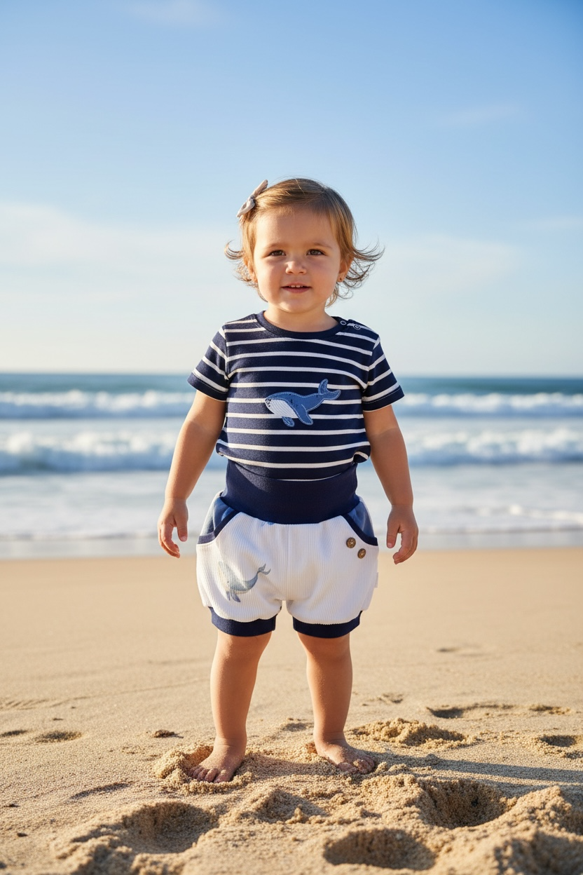 Dieses charmante Sommer Set verbindet maritimen Stil mit hochwertiger Handarbeit. Das Set besteht aus einem gestreiften Bio-Baumwoll-Shirt und einer detailreichen Pumphose mit Wal-Applikation sowie Rib-Jersey-Einsätzen im Walprint-Design. Die natürliche Bio-Baumwolle sorgt für angenehmen Tragekomfort und Hautfreundlichkeit, während die liebevoll verarbeiteten Details jedem Outfit Charakter verleihen. Perfekt für kleine Abenteurer, die Qualität und Stil lieben – ein zeitloses Lieblingsstück für sonnige Tage.